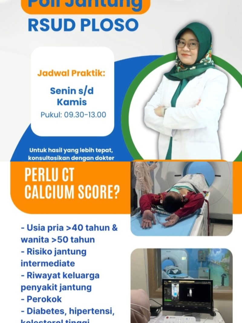 Sebelum melakukan pemeriksaan, pasien disarankan berkonsultasi terlebih dahulu di Poli Jantung RSUD Ploso. Konsultasi dilakukan oleh dr. Izzati Nadhifa R., Sp.JP., FIHA, Dokter Spesialis Jantung dan Pembuluh Darah, dengan jadwal praktik Senin hingga Kamis pukul 09.30–13.00 WIB. Biaya pemeriksaan CT Calcium Score di RSUD Ploso ditetapkan sebesar Rp 1.200.000.